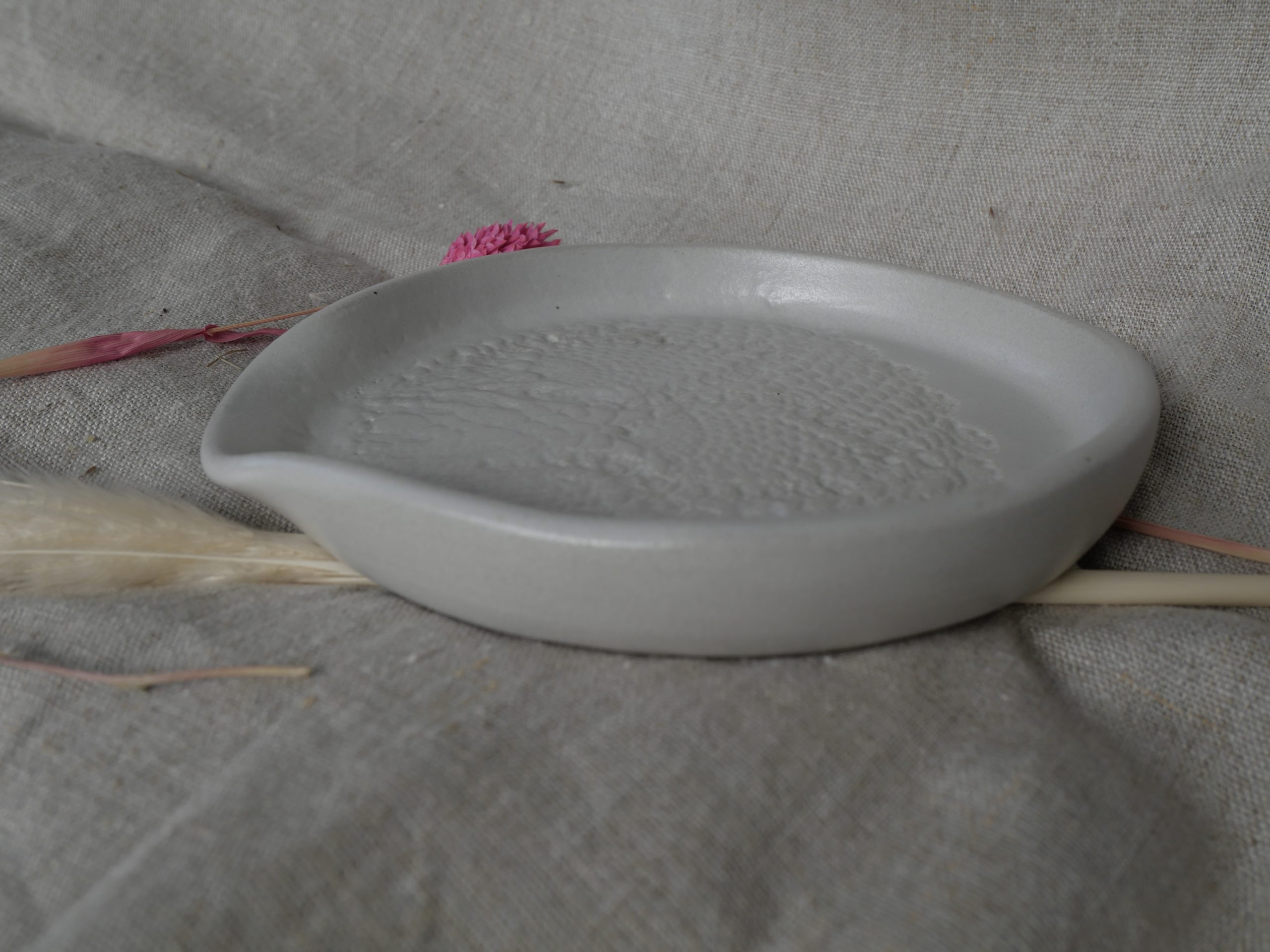 Repose-cuillères 100% fait main. Tourné et modelé en grès puis émaillé par mes soins.   Chaque pièce présente des nuances et reflets uniques, propres au processus de fabrication artisanale.
