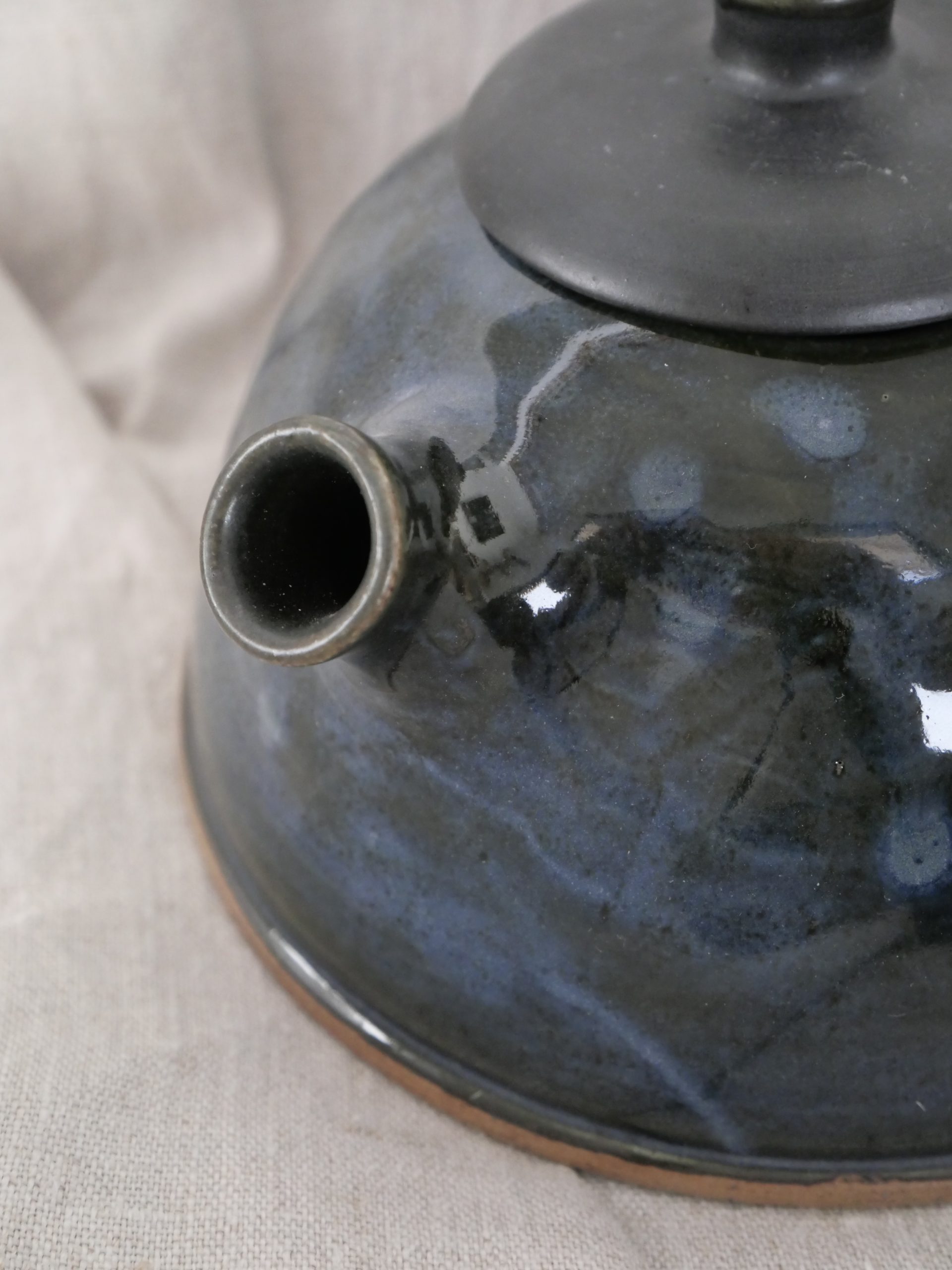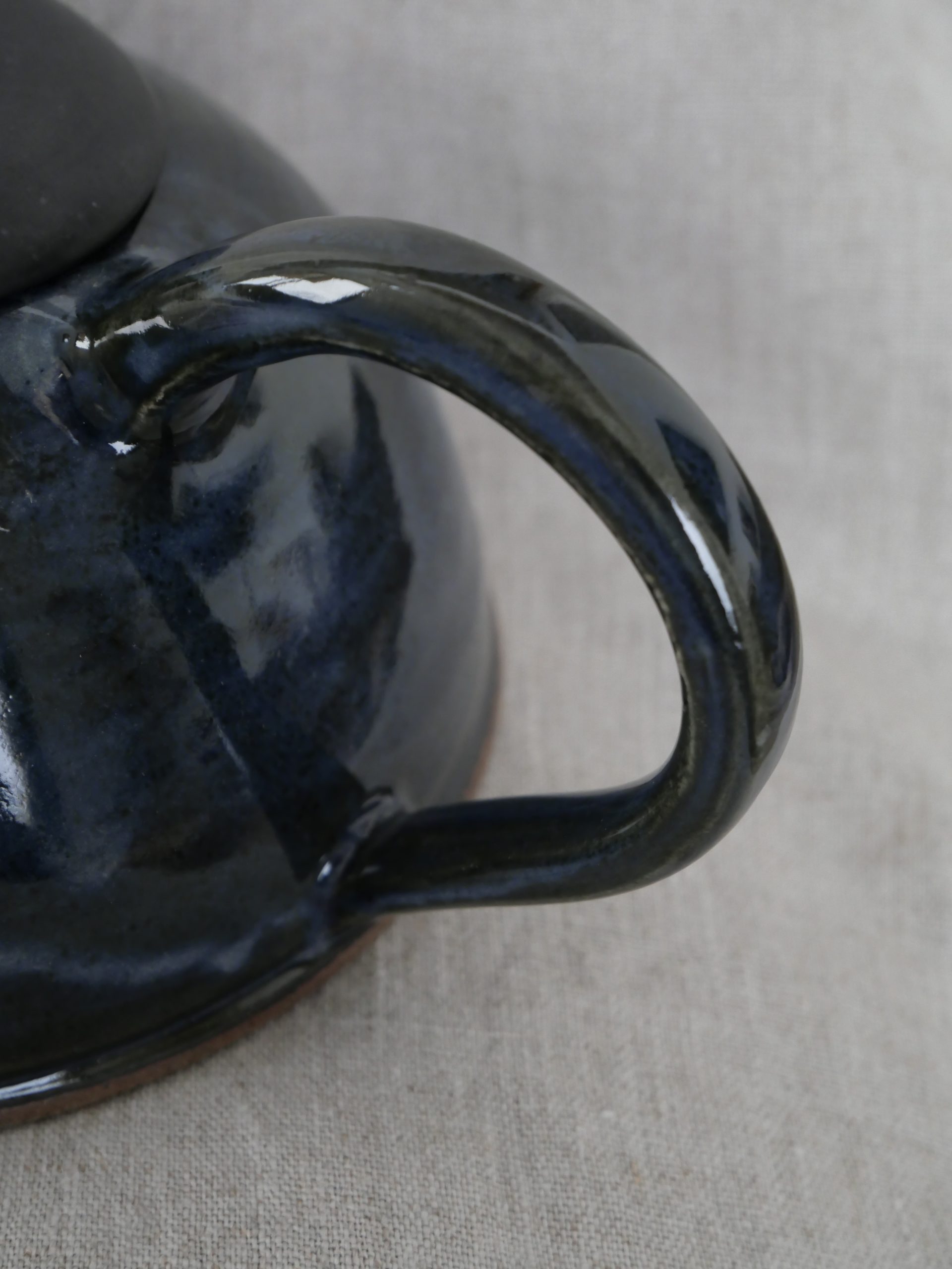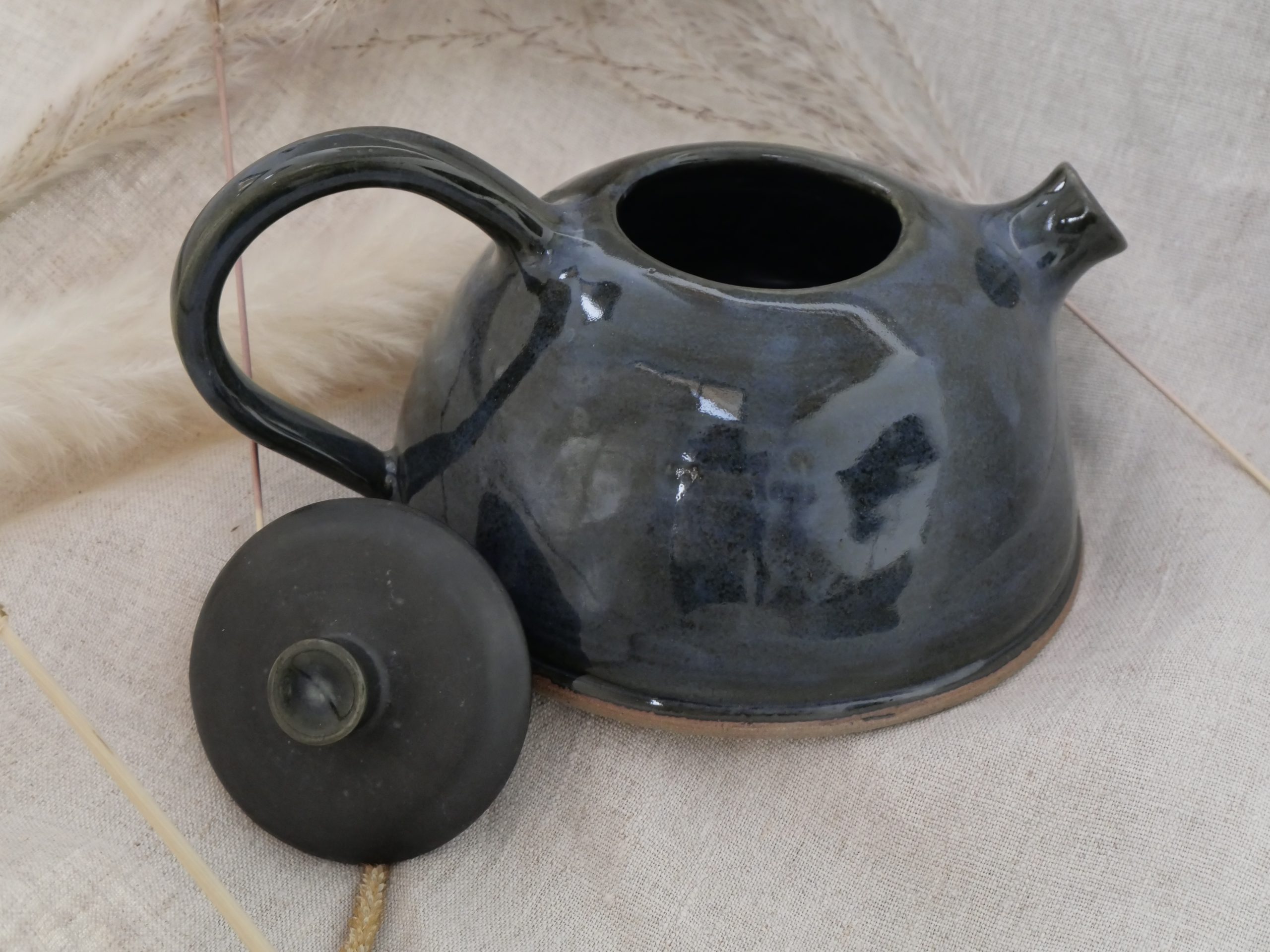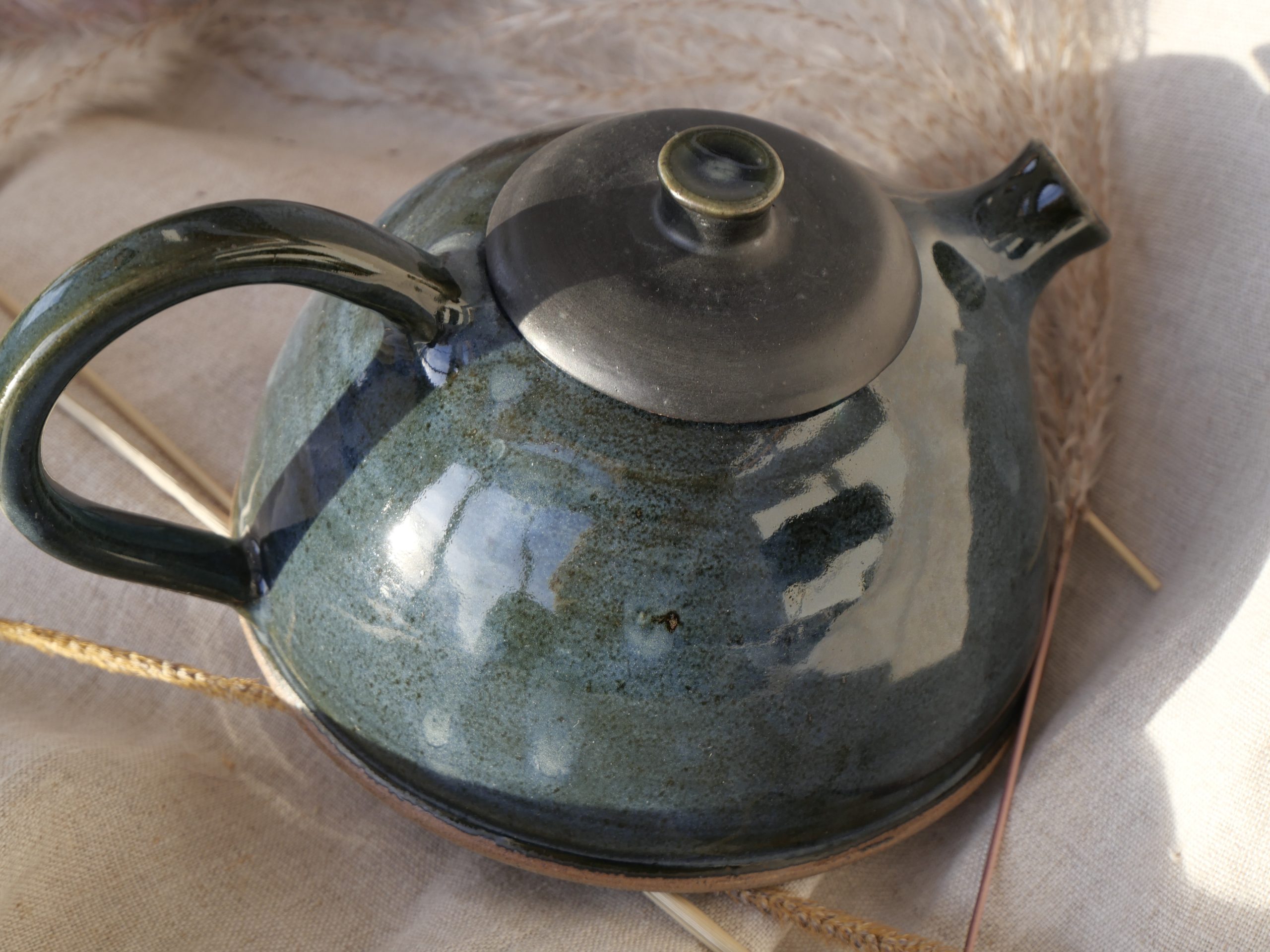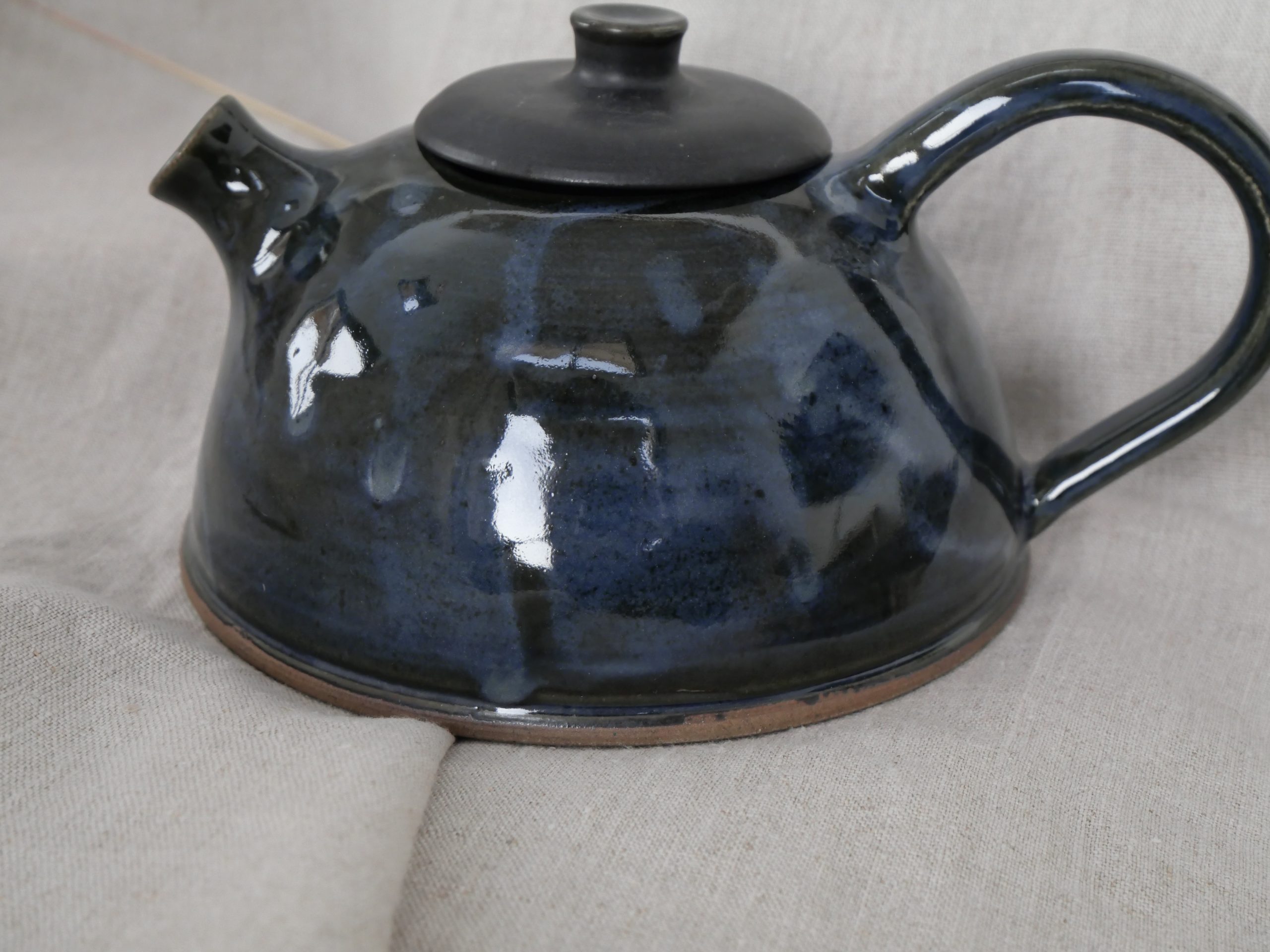 Théière entièrement façonnée à la main : tournage, assemblage, bec, anse et émaillage artisanaux.